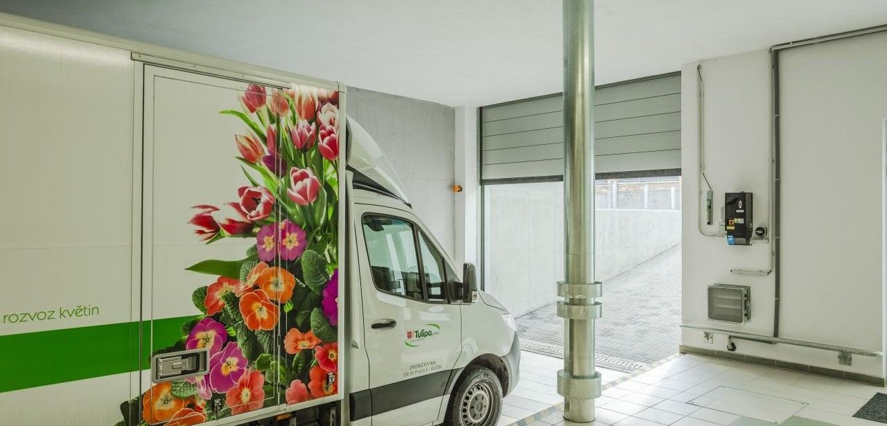 Bei der Auswahl des Tores legte TULIPA PRAHA großen Wert auf Zuverlässigkeit, Langlebigkeit und eine ästhetische Optik, die zum modernen Design des Versandstandortes passt. Das EFA-SST(R) Essential von EFAFLEX erfüllt all diese Anforderungen und spiegelt das hohe Niveau der angebotenen Dienstleistungen und Produkte wider. Durch die Edelstahl-Lichtsignalanlage an der Verladerampe erhalten die Fahrer der Blumenlieferwagen eine klare Information darüber, ob die Verladebox frei oder belegt ist.