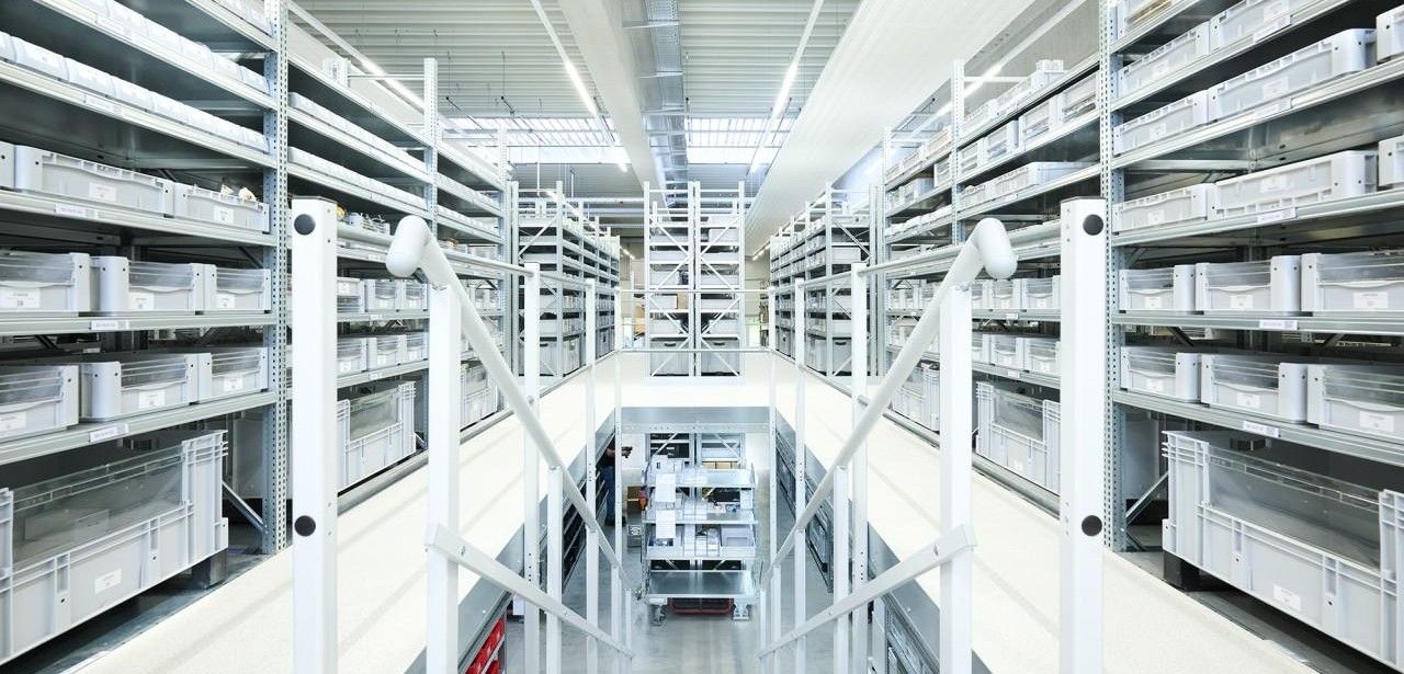 Lagerung aller Kleinteile; eine mehrgeschossige Fachbodenregalanlage (Foto: Patric Dressel für BITO-Lagertechnik)